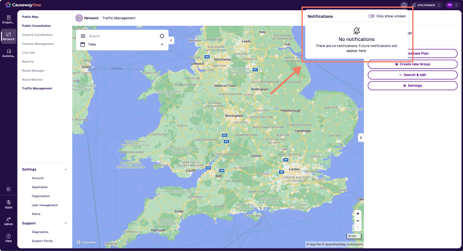 • Notifications are grouped under “Notifications” in the top right corner. The CausewayOne Platform notifications will show up here and are different from the alerts option under the settings menu.